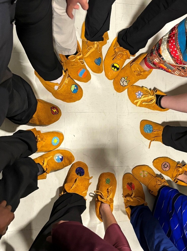 One project that grew from this work was moccasin making with the Grade 8 class. After spending time working with hides, creating moccasins felt like a natural next step. Each student makes a pair of moccasins for another classmate to gift at the Grade 8 Promotion Ceremony. “There are so many teachings involved. Generosity, connection, family, and caring for one another. This work is a way for them to build all those strengths through hands-on learning and storytelling,” said BigEagle-Kequahtooway.